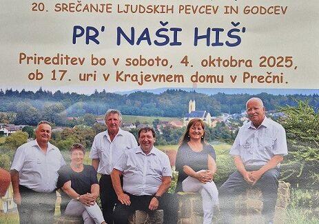 Četrtek, 2. oktober 2025, ob 16.10 – Ljudski pevci Vaški zvon, ki delujejo v okviru Kulturnega društva Prečna, vabijo v domači krajevni dom na 20.srečanje ljudskih pevcev in godcev, imenovano Pr’ naši hiš’. Nastopile bodo skupine z različnih koncev Slovenije, med njimi seveda tudi organizatorji. Z nami bosta JOŽE CESAR in IGOR BOŽIČ.